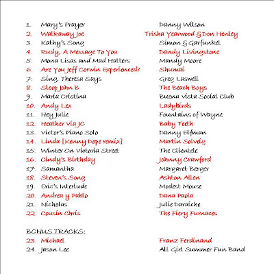 I created this mix CD for my extended family. One song per person, plus two bonus tracks to include the serious boyfriends. These CDs were also distributed in slim cases, and thus were accompanied only by two-sided, single page inserts.